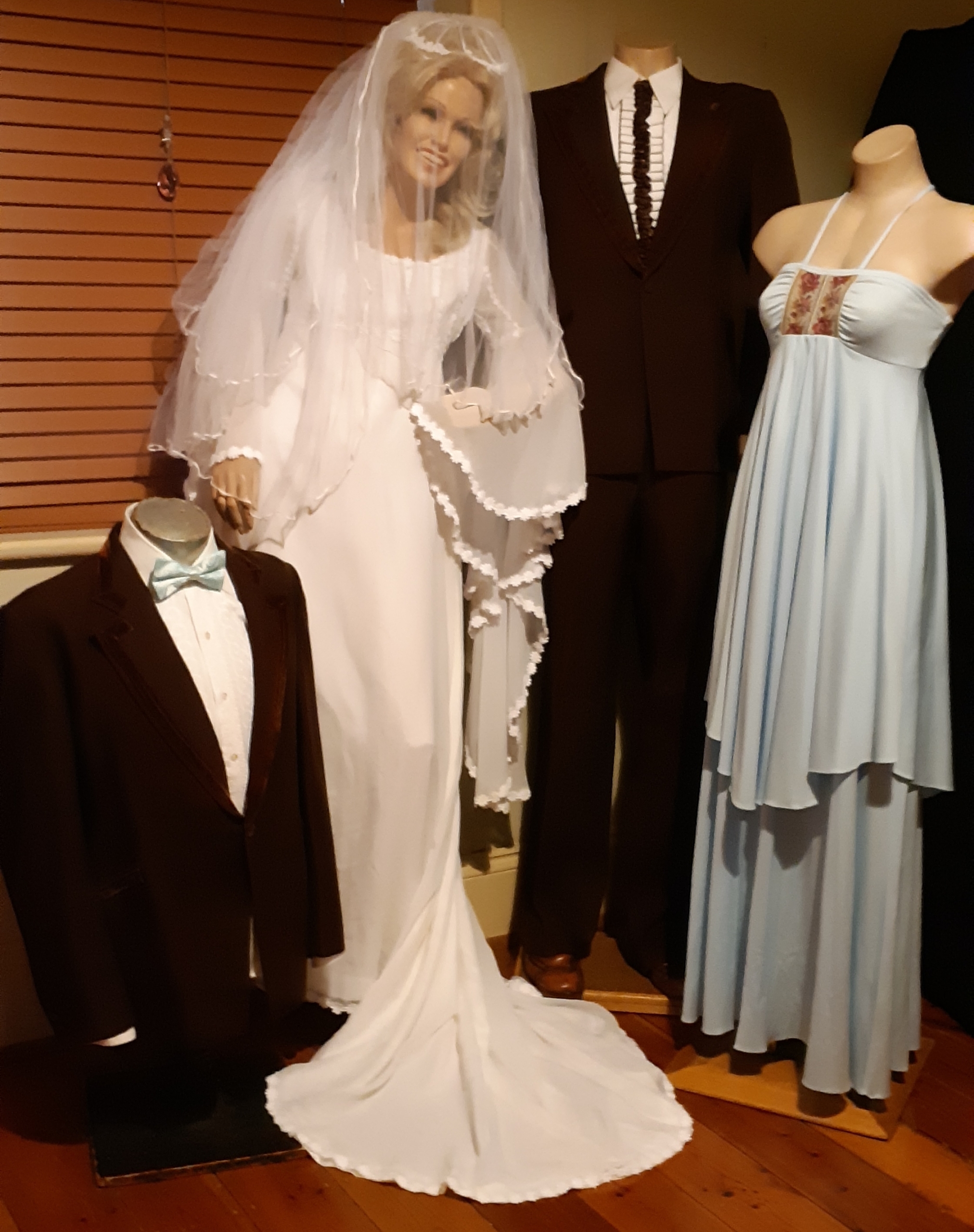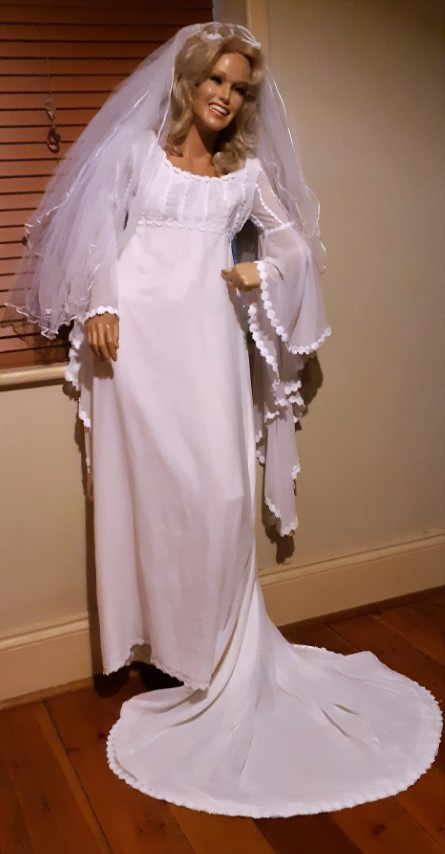 I have included photos of how we dressed up our mannequin with a bridal party and another photo of the dress on the original bride in 1976.