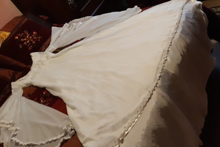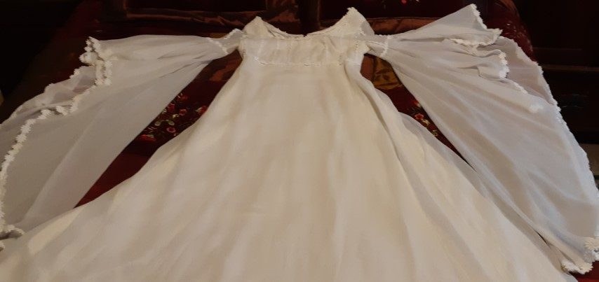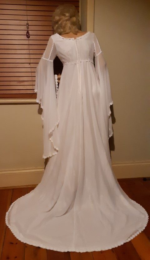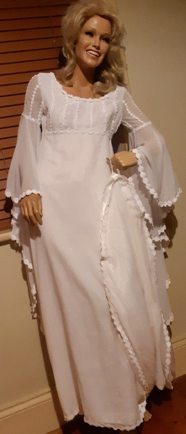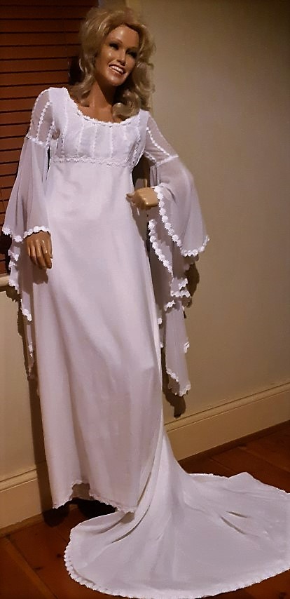 Link to: 1970’s, Wedding Dress & Veil, Bell sleeved, poly/cotton, handmade, size 10-12 Link to: 1970’s, Wedding Dress & Veil, Bell sleeved, poly/cotton, handmade, size 10-12 1970’s, Wedding Dress & Veil, Bell sleeved, poly/cotton, handmade,... Link to: 1970’s, Chiffon Maxi Dress, white, bell sleeves, polyester, by ‘Ballerina’ size 8 Link to: 1970’s, Chiffon Maxi Dress, white, bell sleeves, polyester, by ‘Ballerina’ size 8 Chiffon Maxi Dress, 1970's, Long bell sleeves, polyester, by 'Ballerina' size 81970’s, Chiffon Maxi Dress, white, bell sleeves, polyester, by ‘Ballerina’...