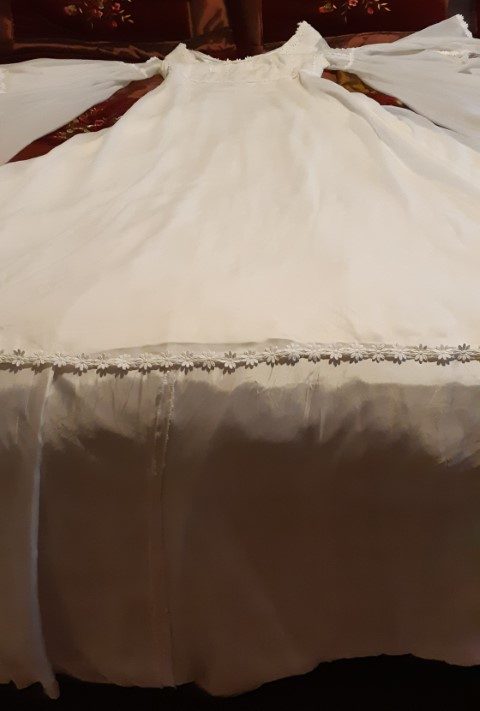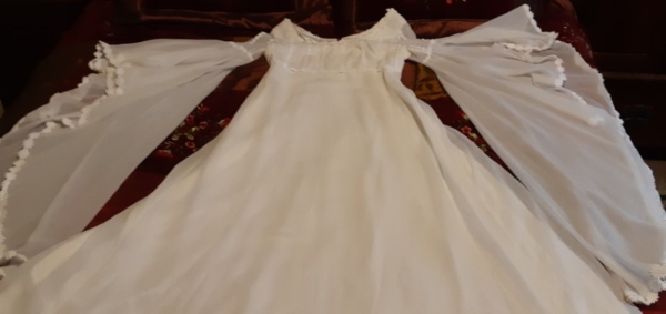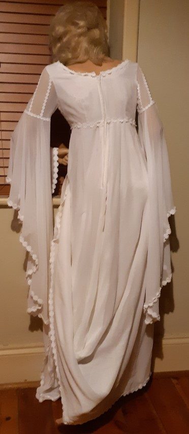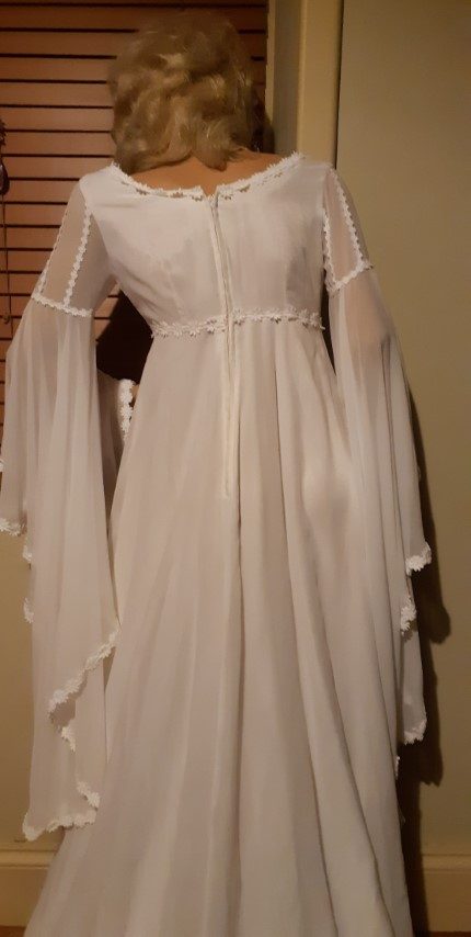 Category: 1970's Vintage/ Retro Tags: 1970's Wedding Dress and Veil, bell sleeves, chiffon, handmade, size 10, White Product Condition: Used Brand: Hand Made