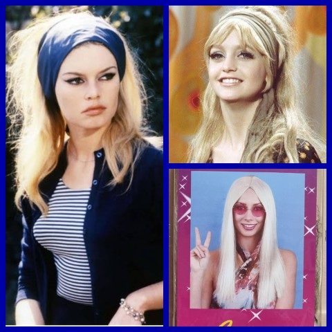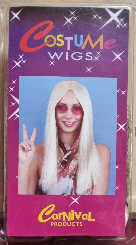 Wig, Long Blonde, Bo-Ho, ‘Goldie Hawn’,  just cut the fringe, or ‘Bridgit Bardot’, add a headscarf. It is from ‘Carnival Products’, synthetic fiber.